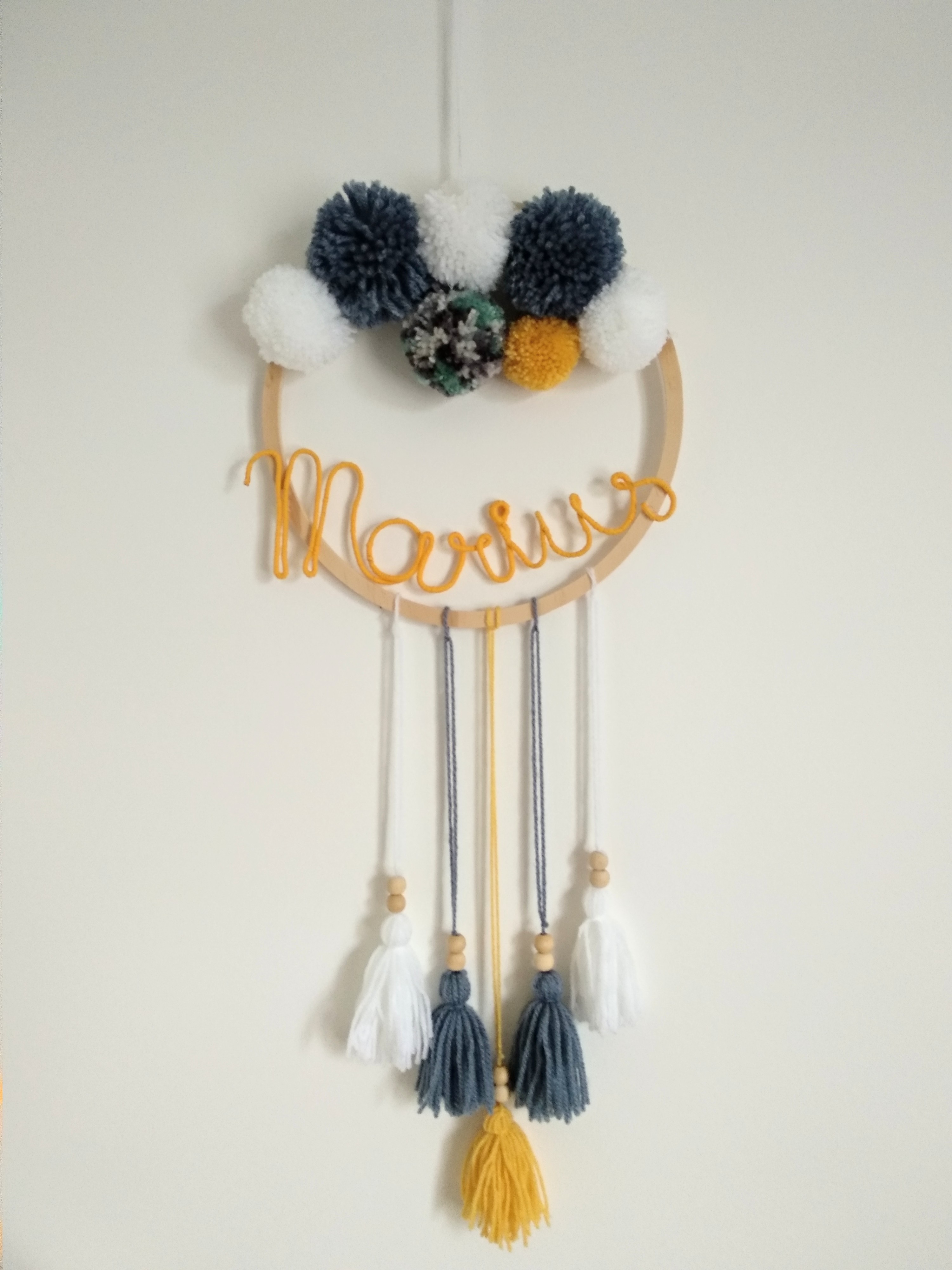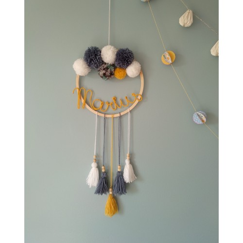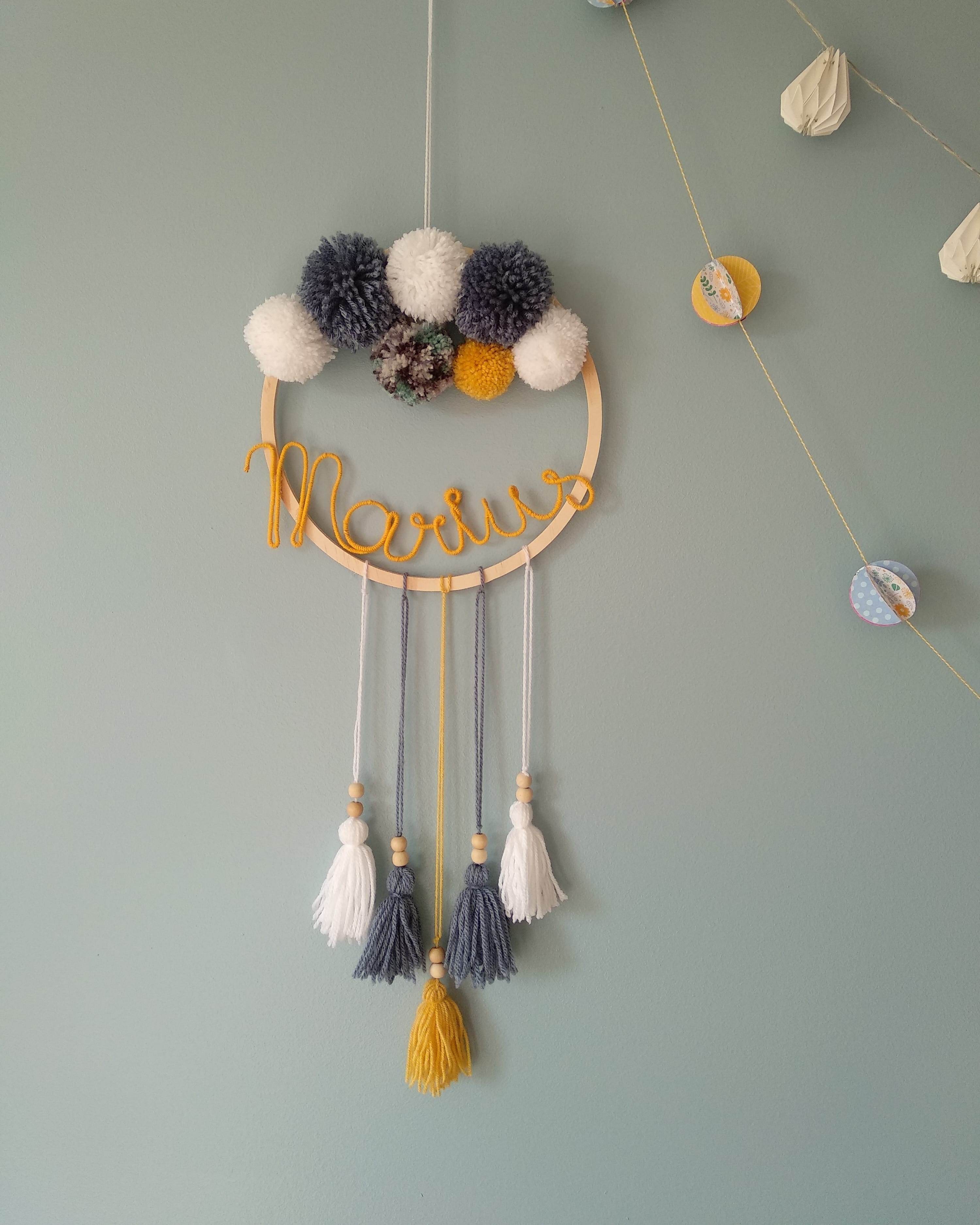Cette couronne prénom avec ses pompons est une jolie décoration murale façon attrape rêve qui sera parfaite pour personnaliser la chambre de votre bébé ou enfant.