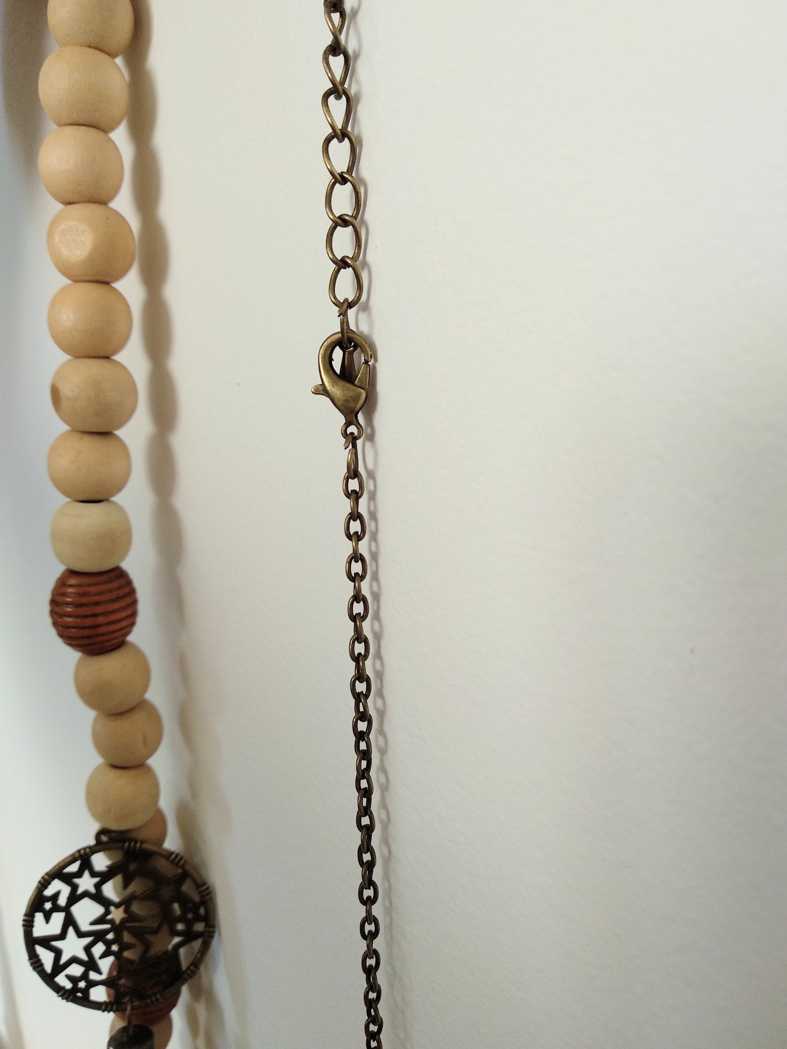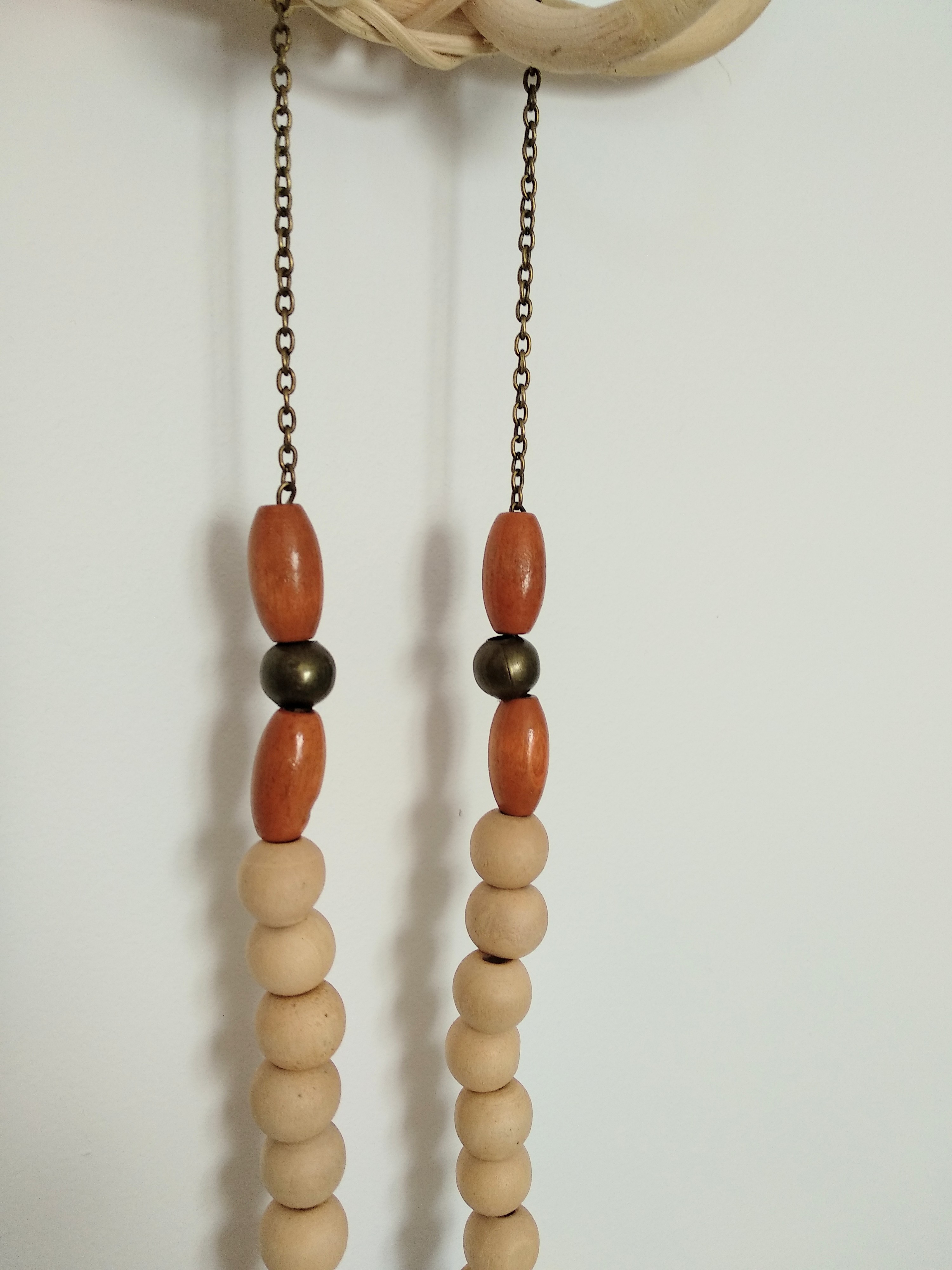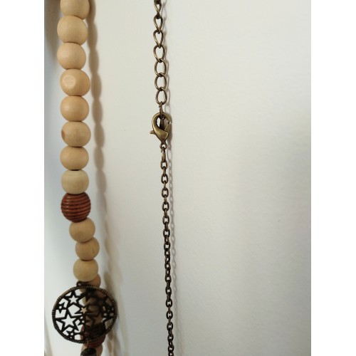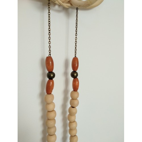 Perles en bois et apprêts en métal bronze.