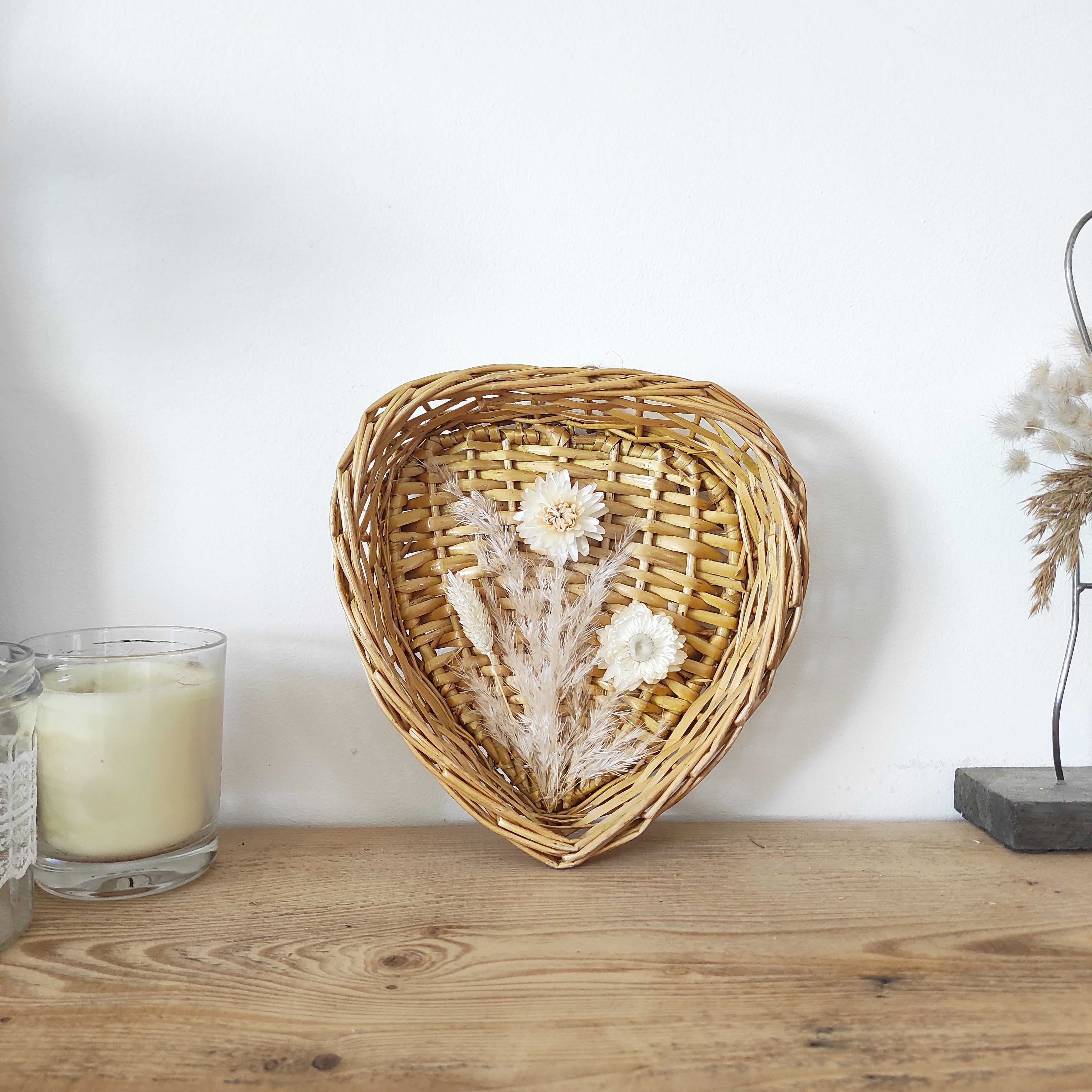 Coeur tressé en fibres naturelles issus du réemploi remis en valeur par des jolies fleurs séchées pour une décoration murale végétale et éco responsable.