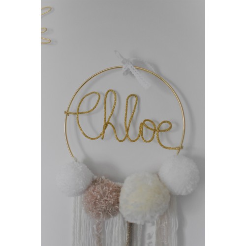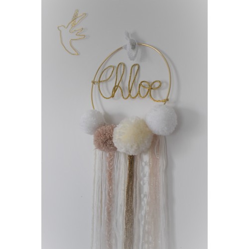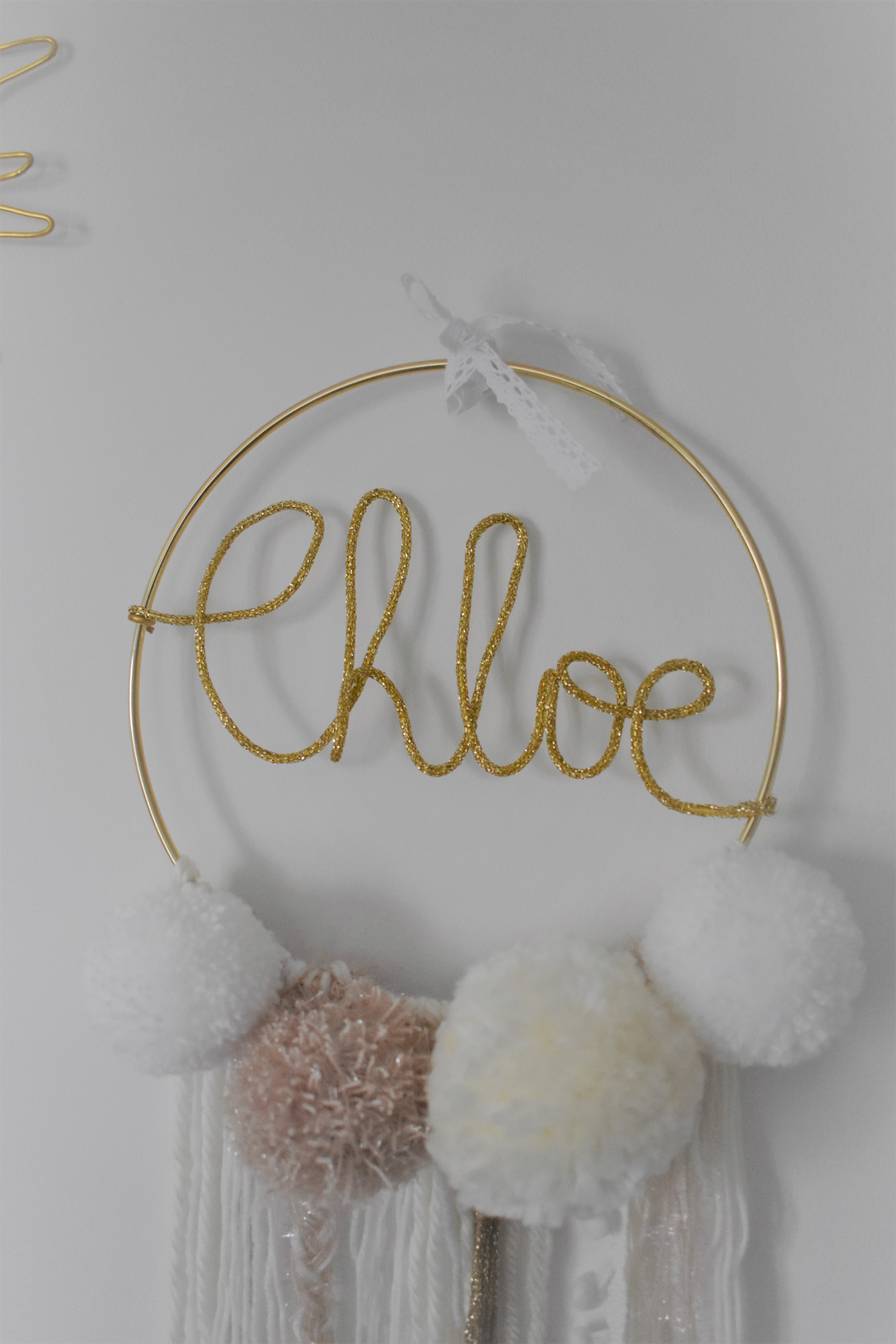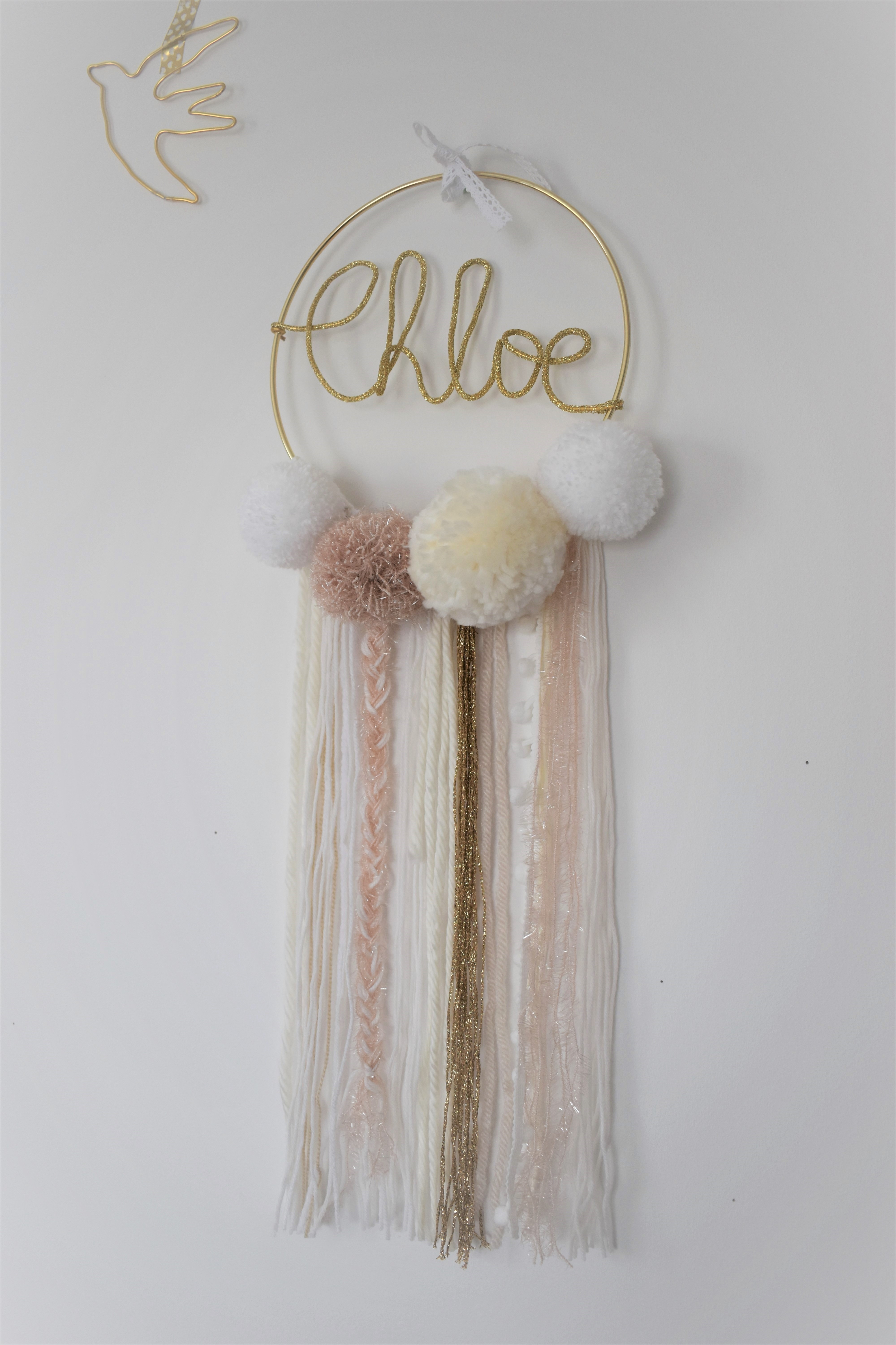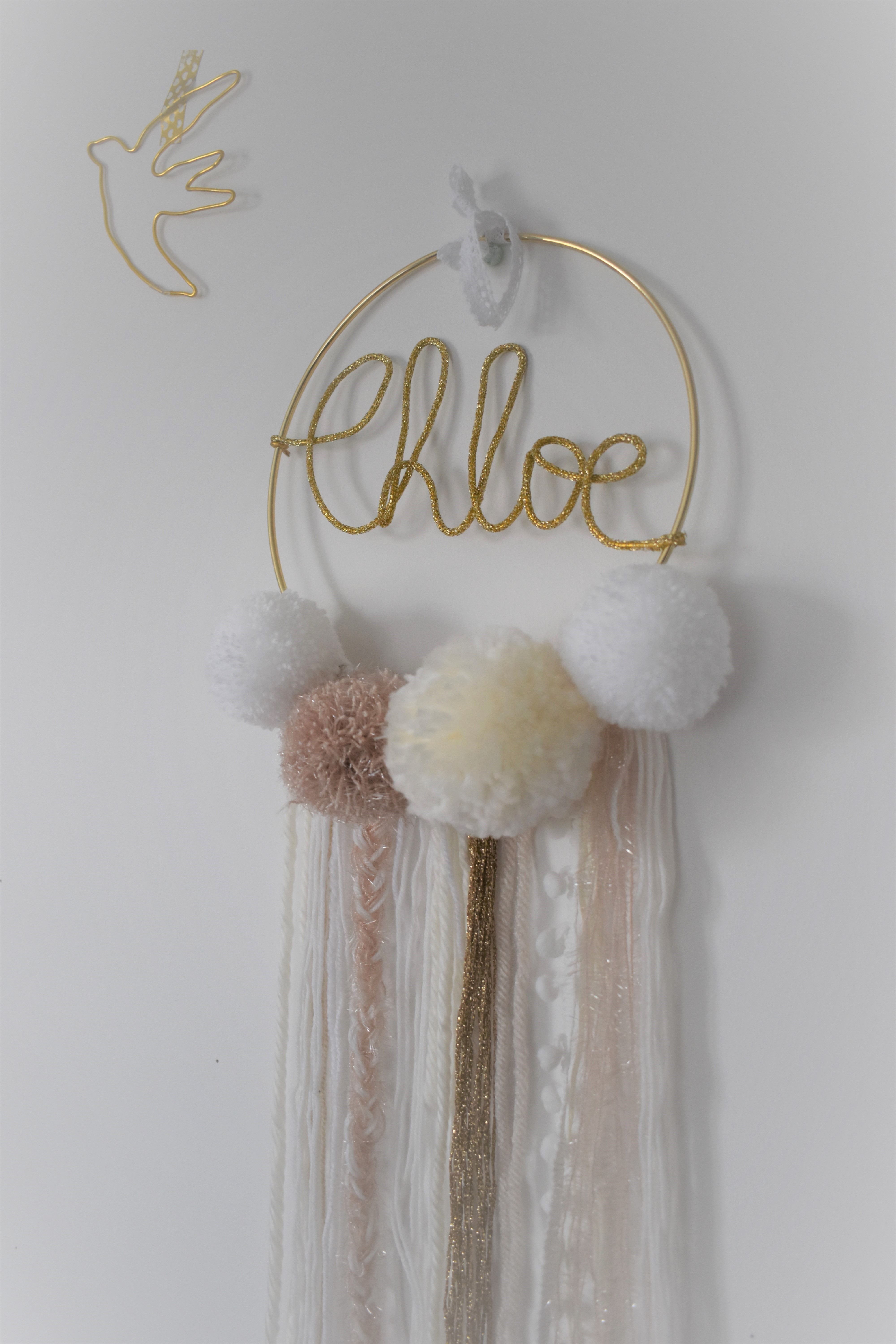 Cette couronne avec prénom personnalisable et pompons est une jolie décoration murale façon attrape rêve qui sera parfaite pour personnaliser la chambre de votre bébé ou enfant.