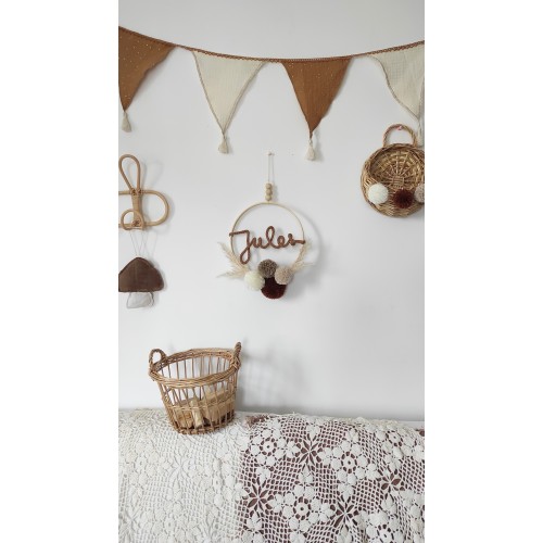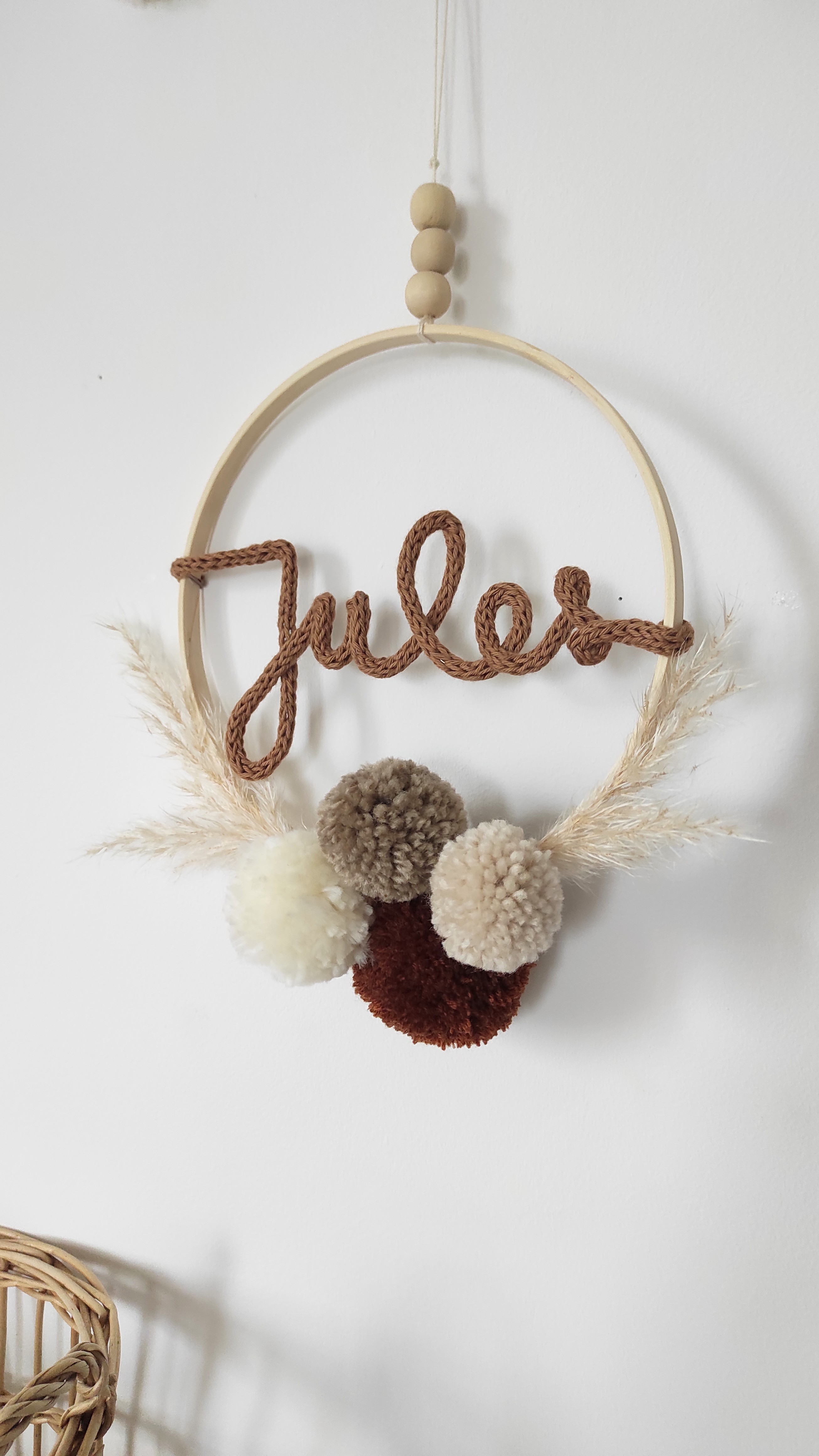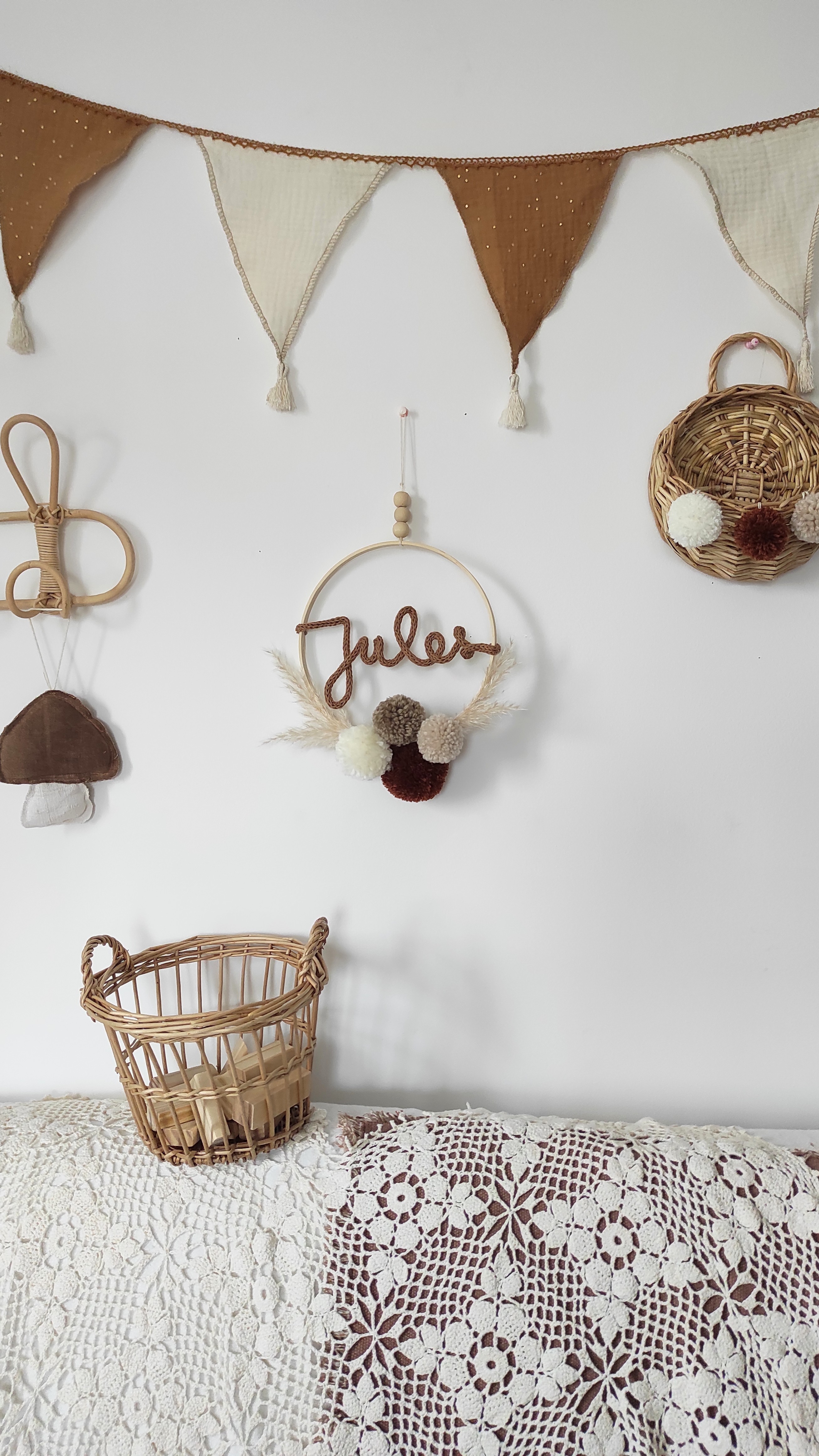 Cette couronne prénom tricotin avec ses fleurs séchées et pompons est une jolie décoration murale qui sera parfaite pour personnaliser la chambre de votre bébé ou enfant.