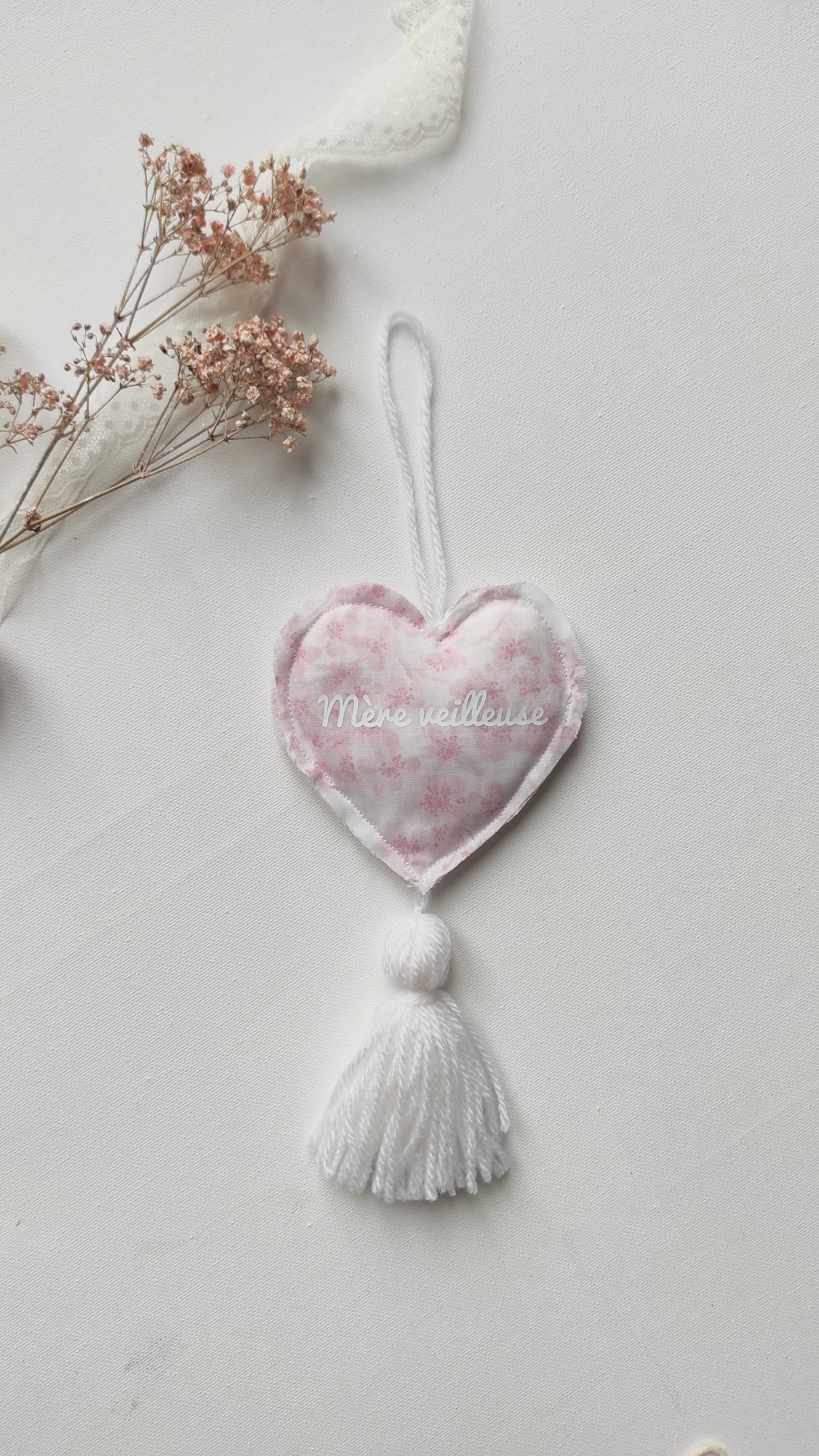 Dimensions du cœur en tissu : 10cm + pompon à franges : 10 cm
