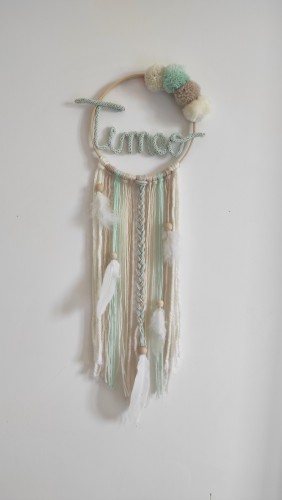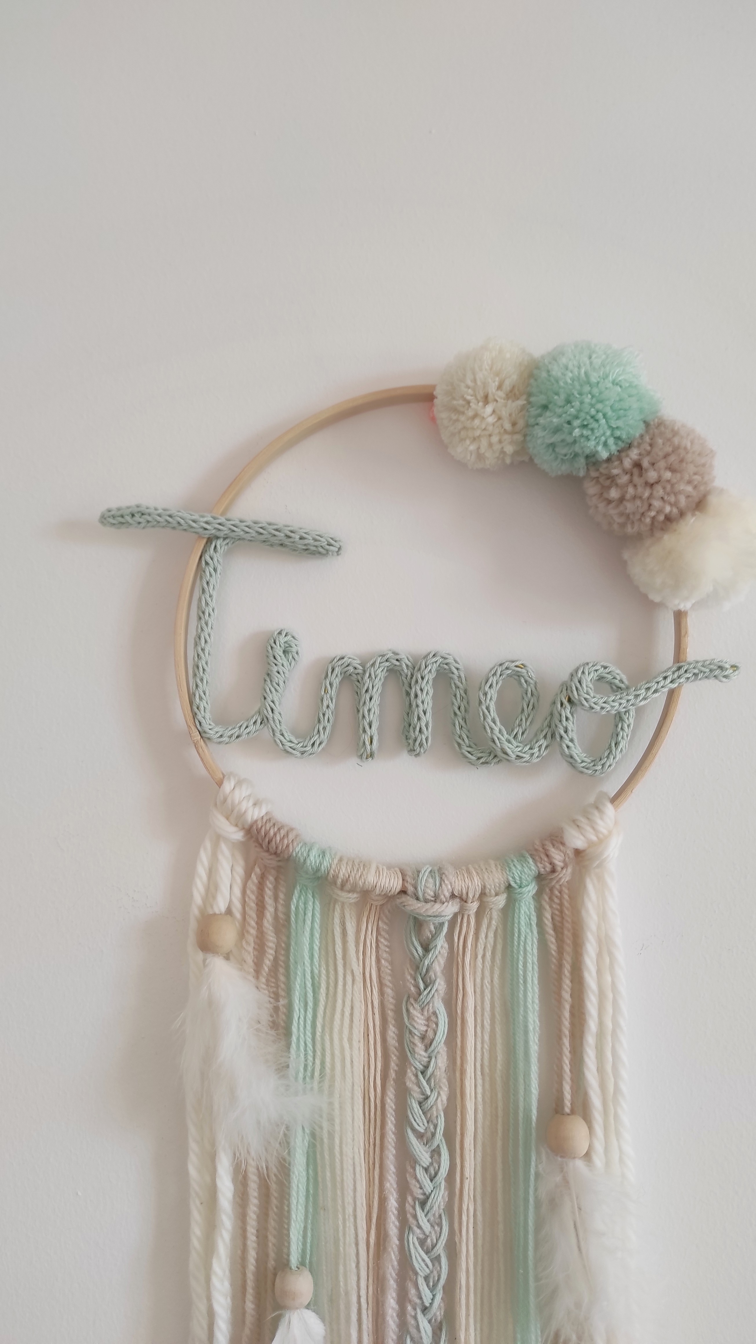 Couronne personnalisable en y ajoutant un mot ou un prénom. Les pompons de laine deviennent une jolie décoration murale façon attrape rêve qui sera parfaite pour personnaliser la chambre de votre bébé ou enfant dans un esprit bohème.