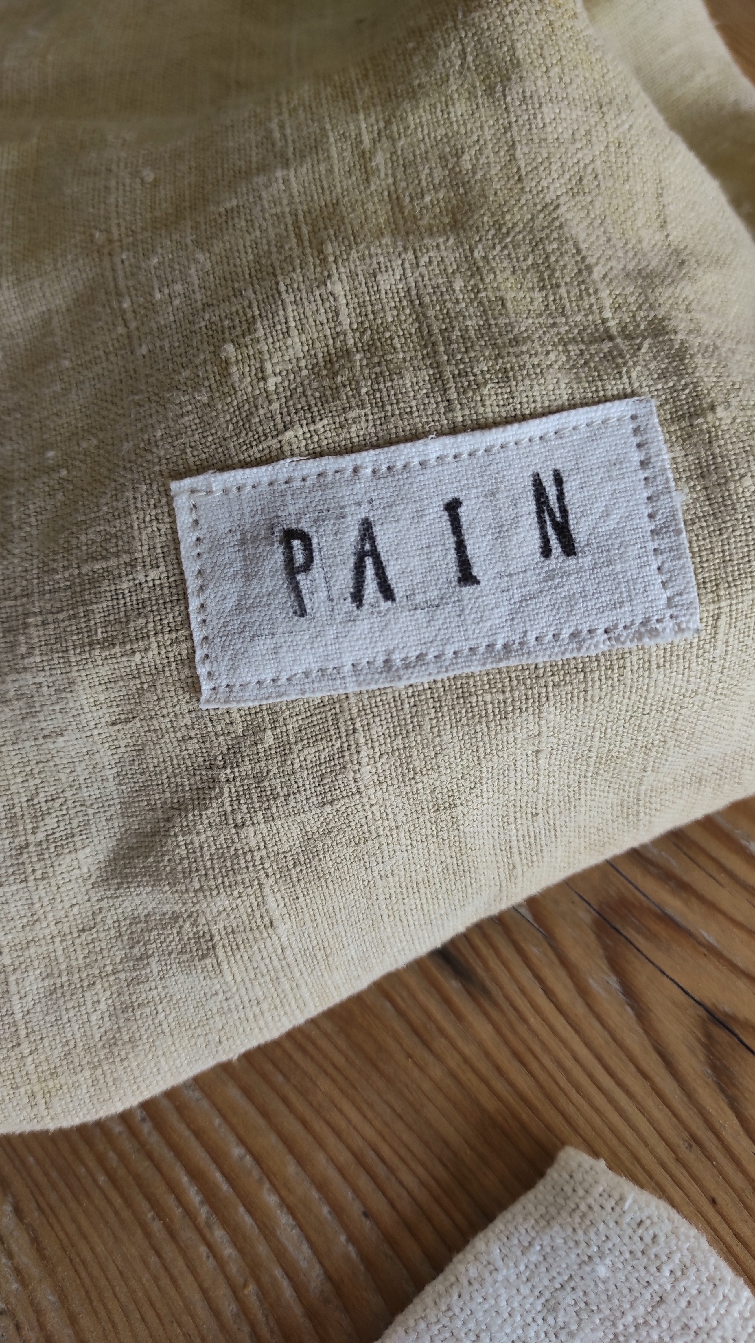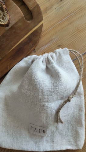 Sac à pain créé à partir de tissus revalorisés : lin ancien, chanvre, métis coton et lin puis coloré avec une teinture végétale artisanale que je réalise dans mon atelier charentais à partir de végétaux et plantes locales.