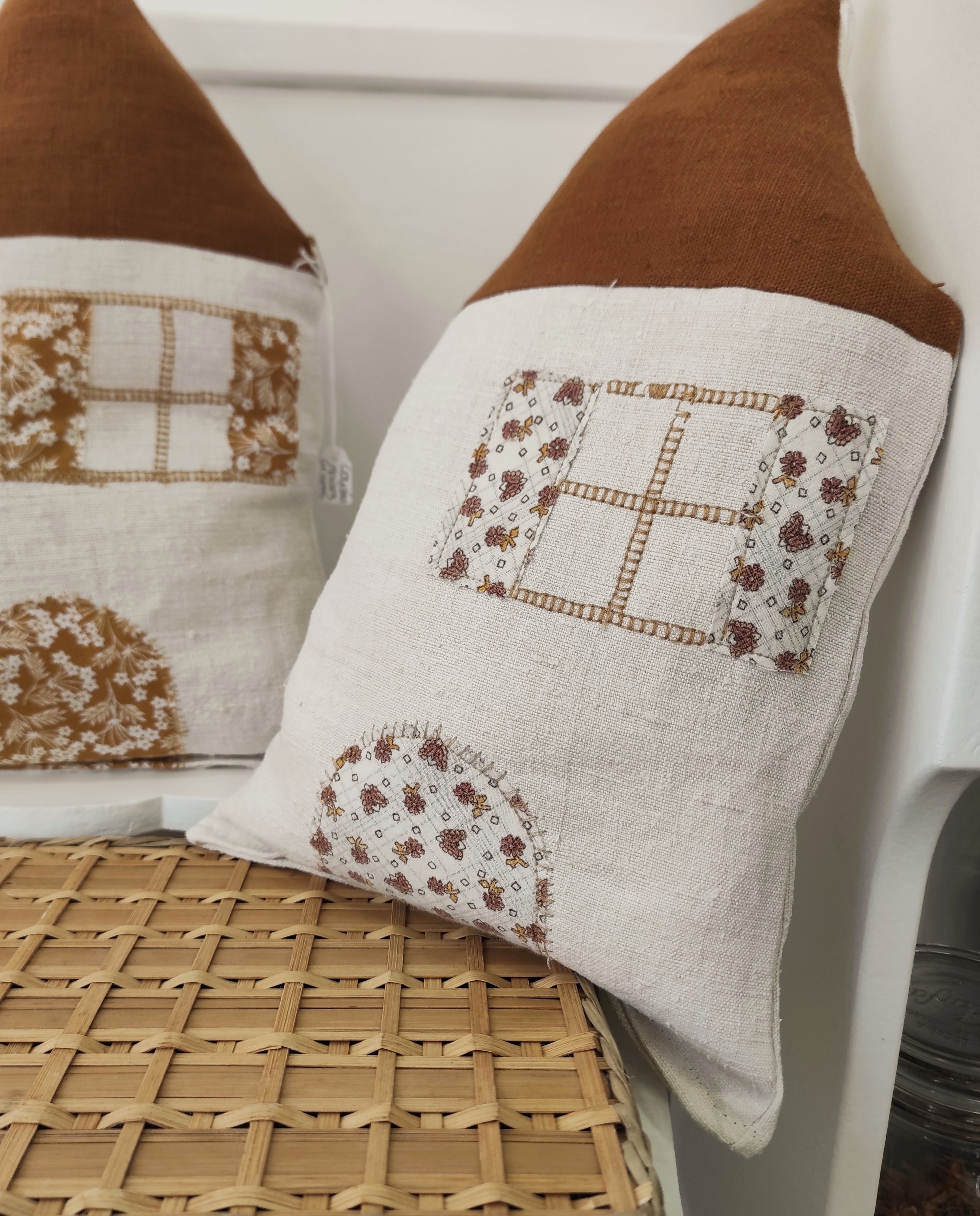 Mélange de lin ancien, de teinture végétale et de tissu fleuri dans les tonalités de rouille et marron...