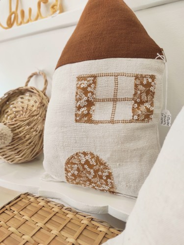 Mélange de lin ancien, de teinture végétale et de tissu fleuri dans les tonalités de rouille et marron...