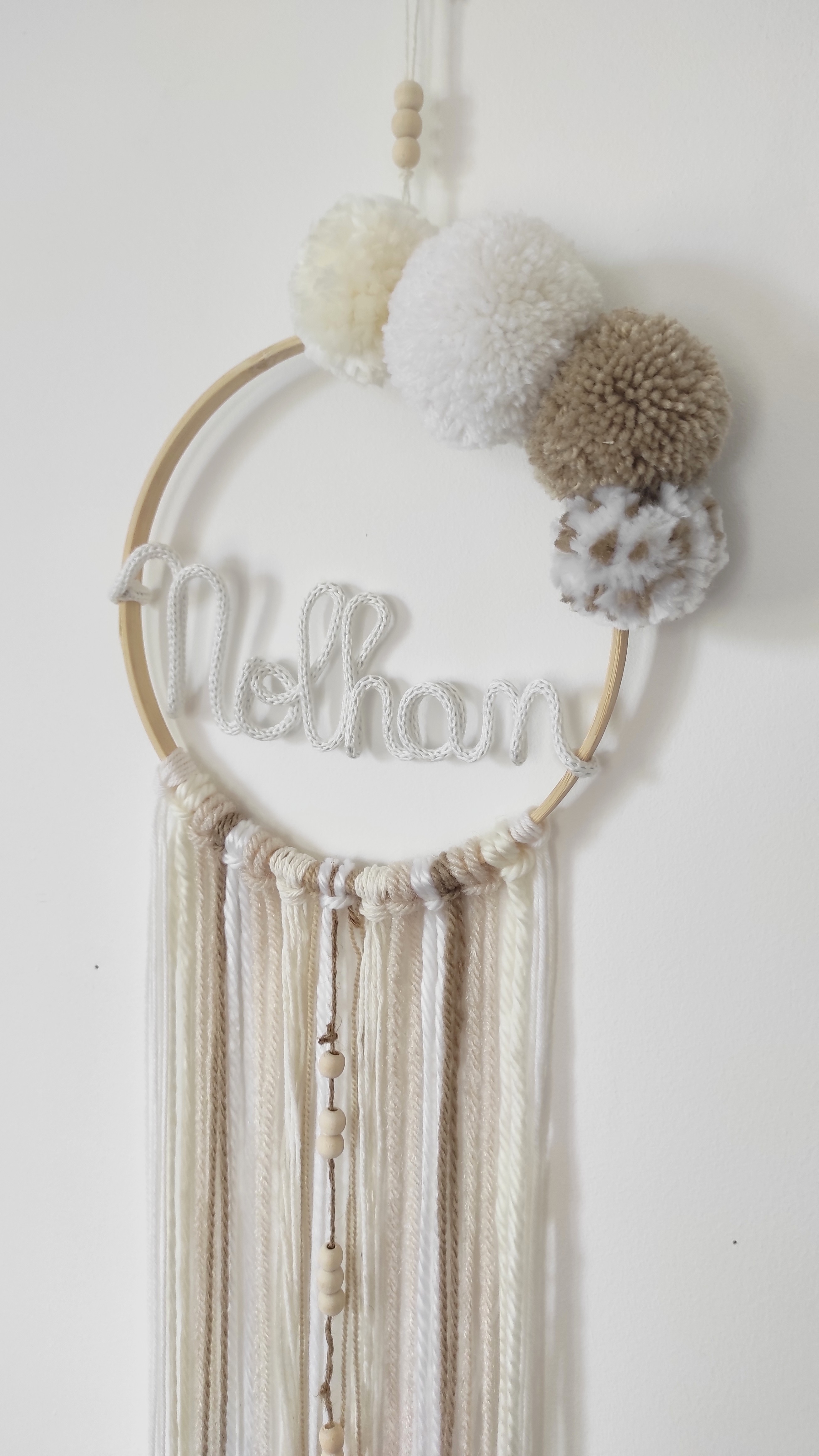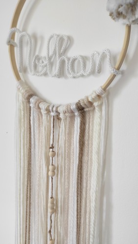 Cette couronne prénom tricotin avec ses pompons est une jolie décoration murale façon attrape rêve qui sera parfaite pour personnaliser la chambre de votre bébé ou enfant.