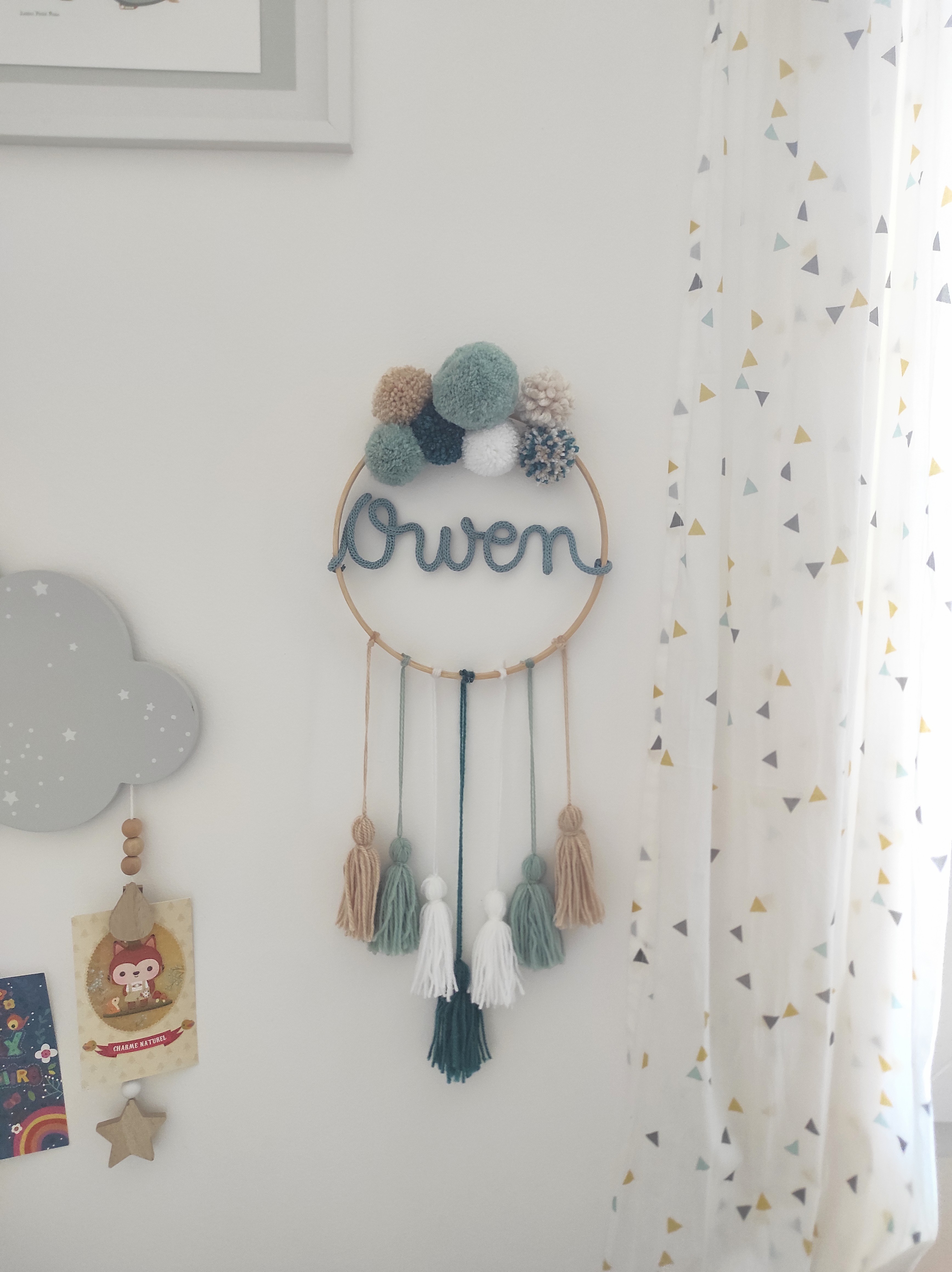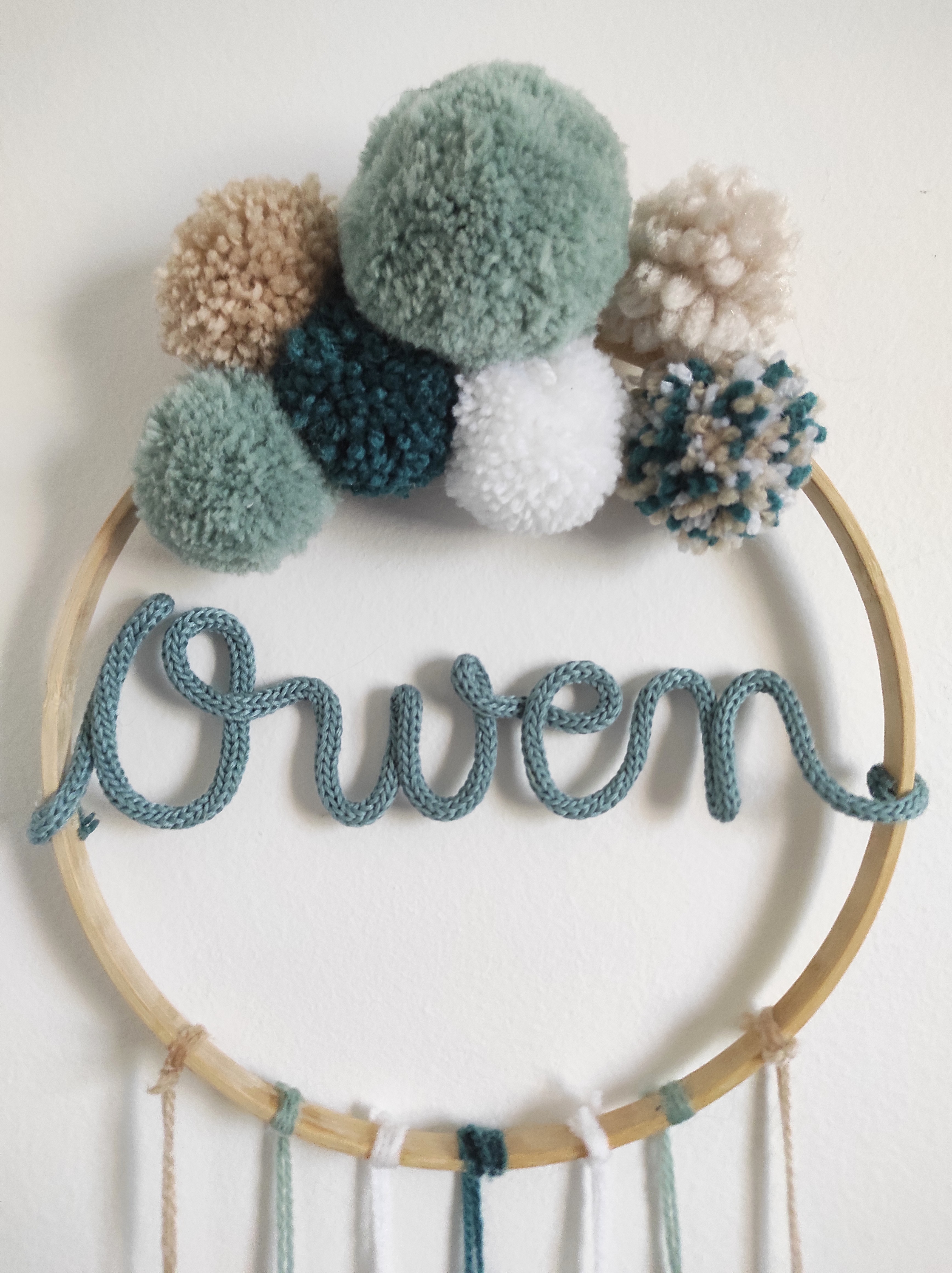 Cette couronne prénom tricotin avec ses pompons est une jolie décoration murale qui sera parfaite pour personnaliser la chambre de votre bébé ou enfant.