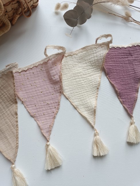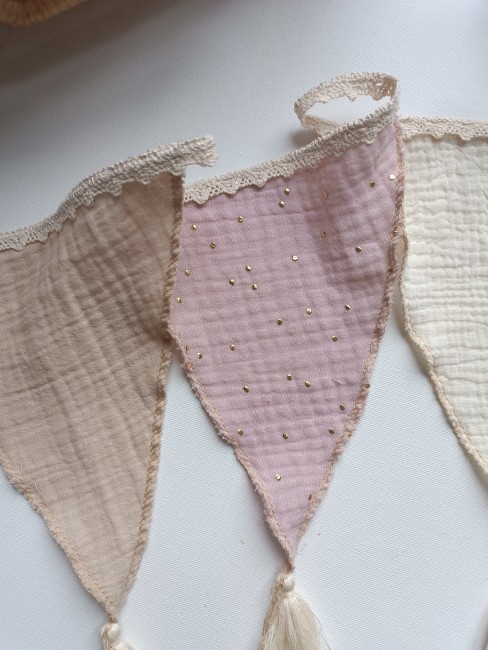 Guirlande de fanions rose et beige en gaze de coton certifié bio Gots et à pois doré Oeko-tex.