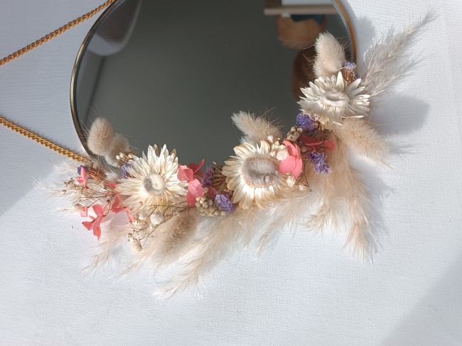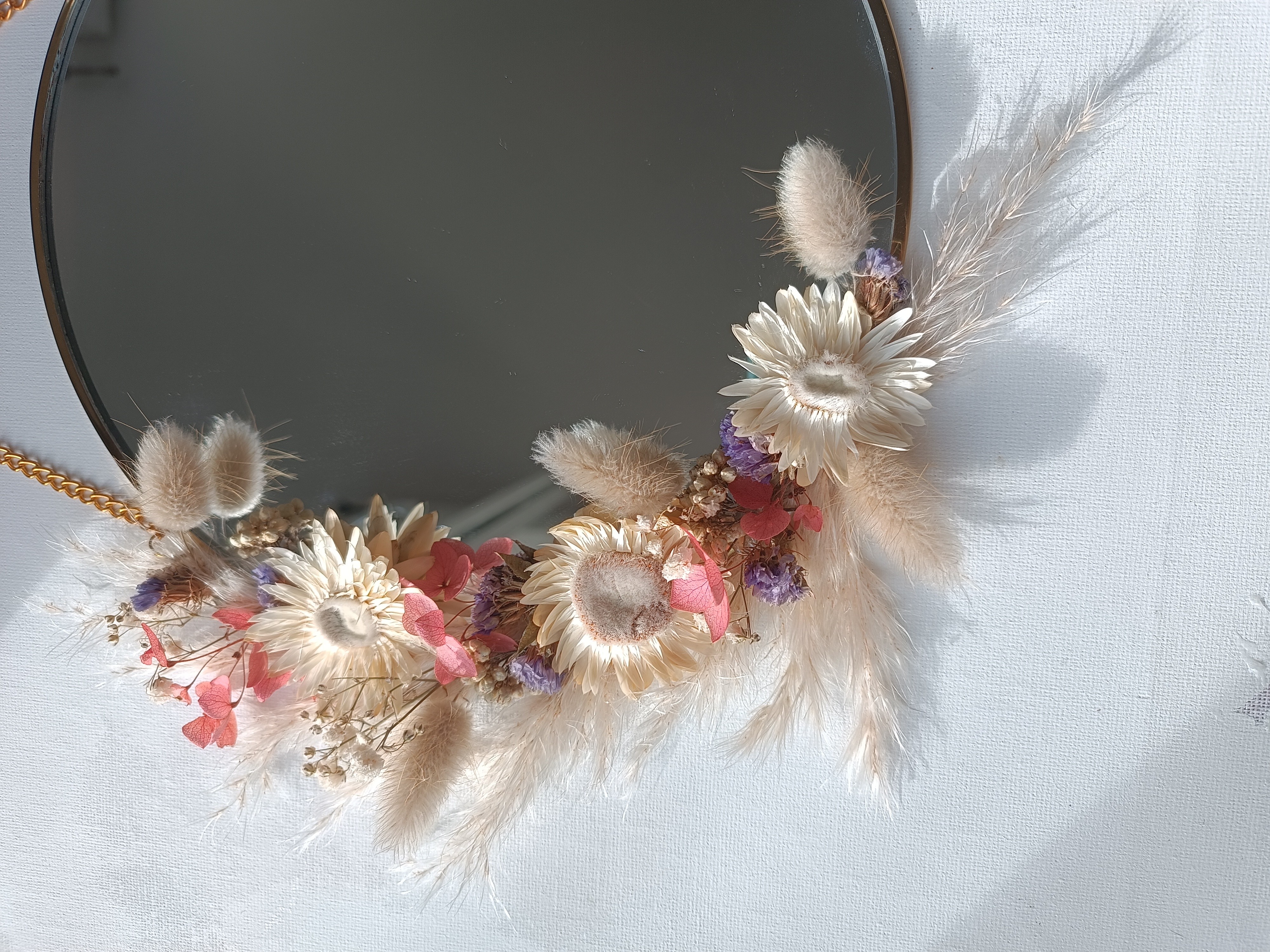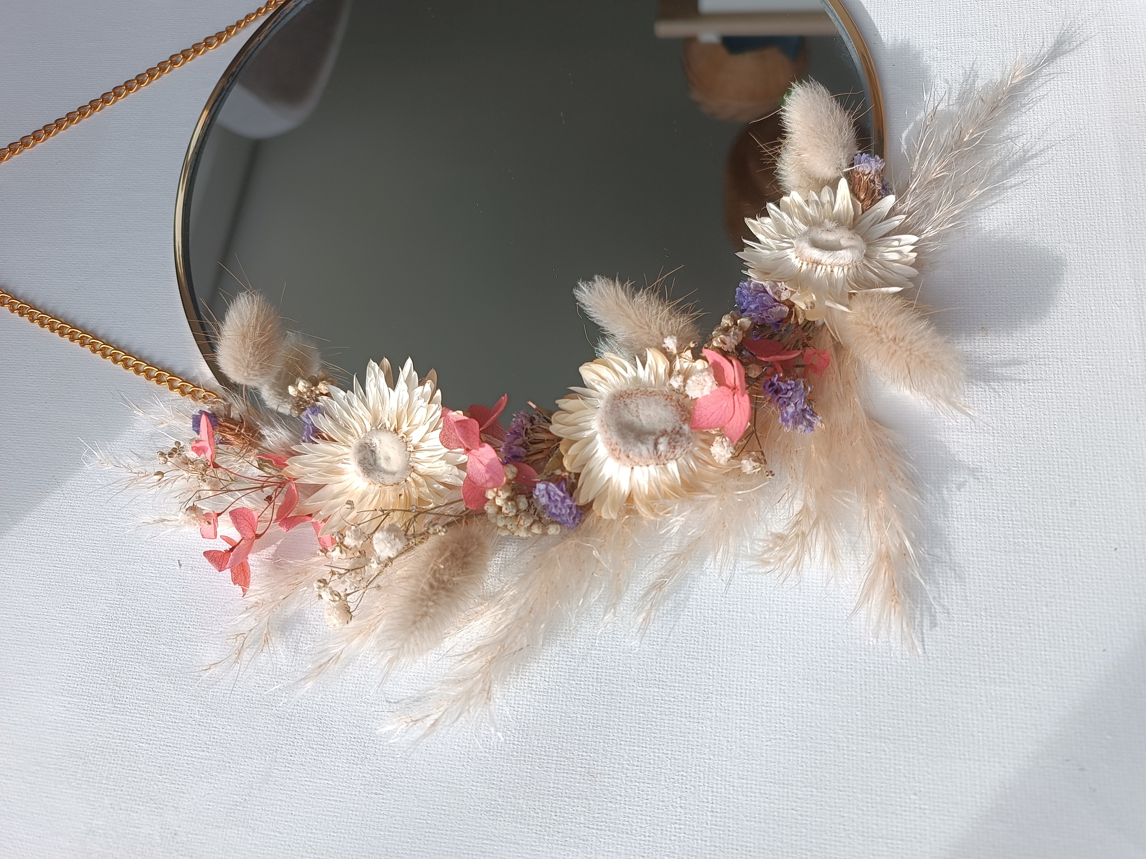 Accueillez la touche de douceur et de végétal dans votre intérieur avec ce miroir orné de fleurs séchées dans les tons de rose et parme.