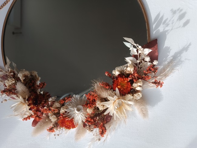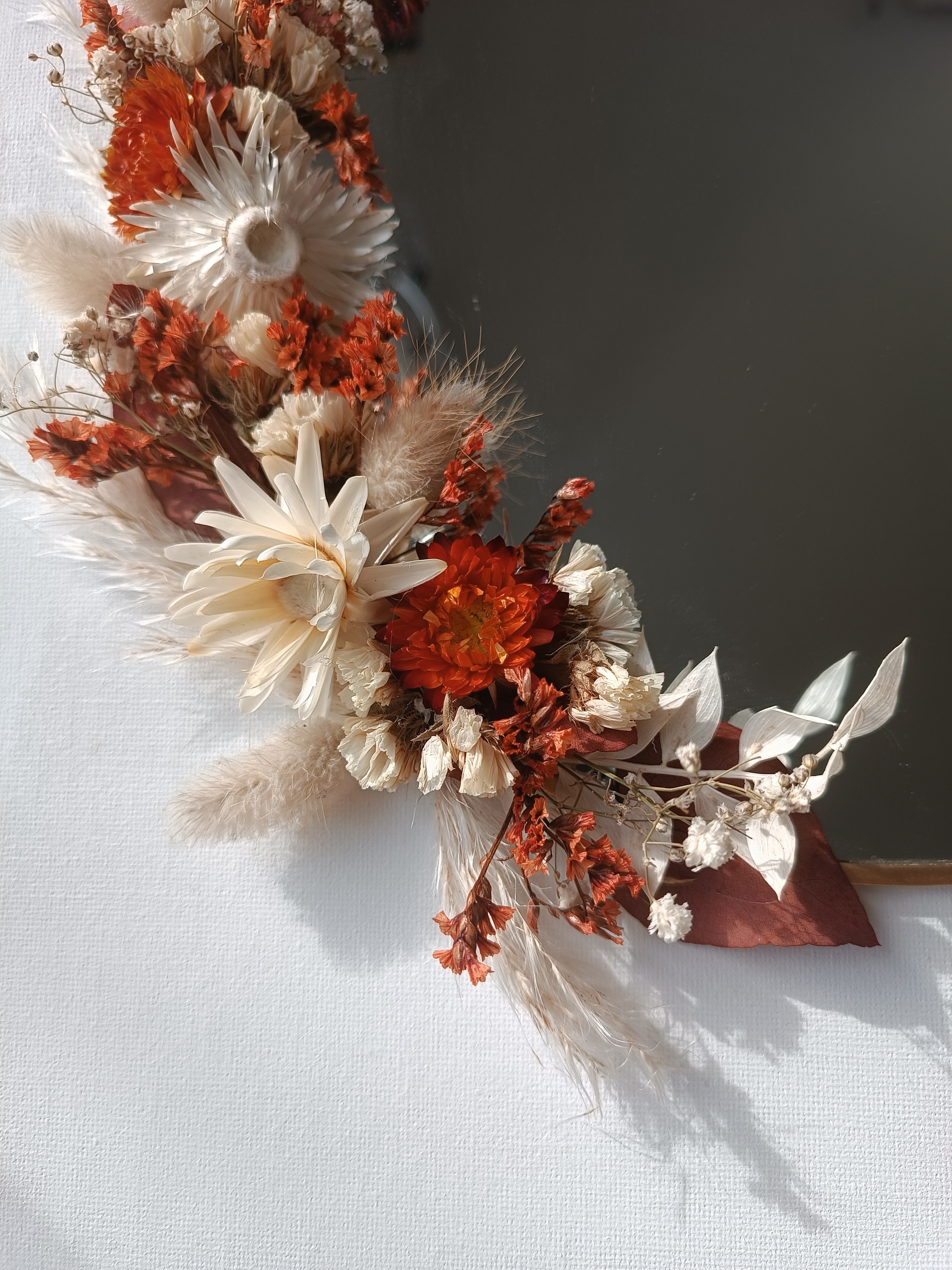 Apportez une touche de douceur et de végétal dans votre intérieur avec ce miroir en métal doré orné de fleurs séchées dans les tons terracotta et écru.