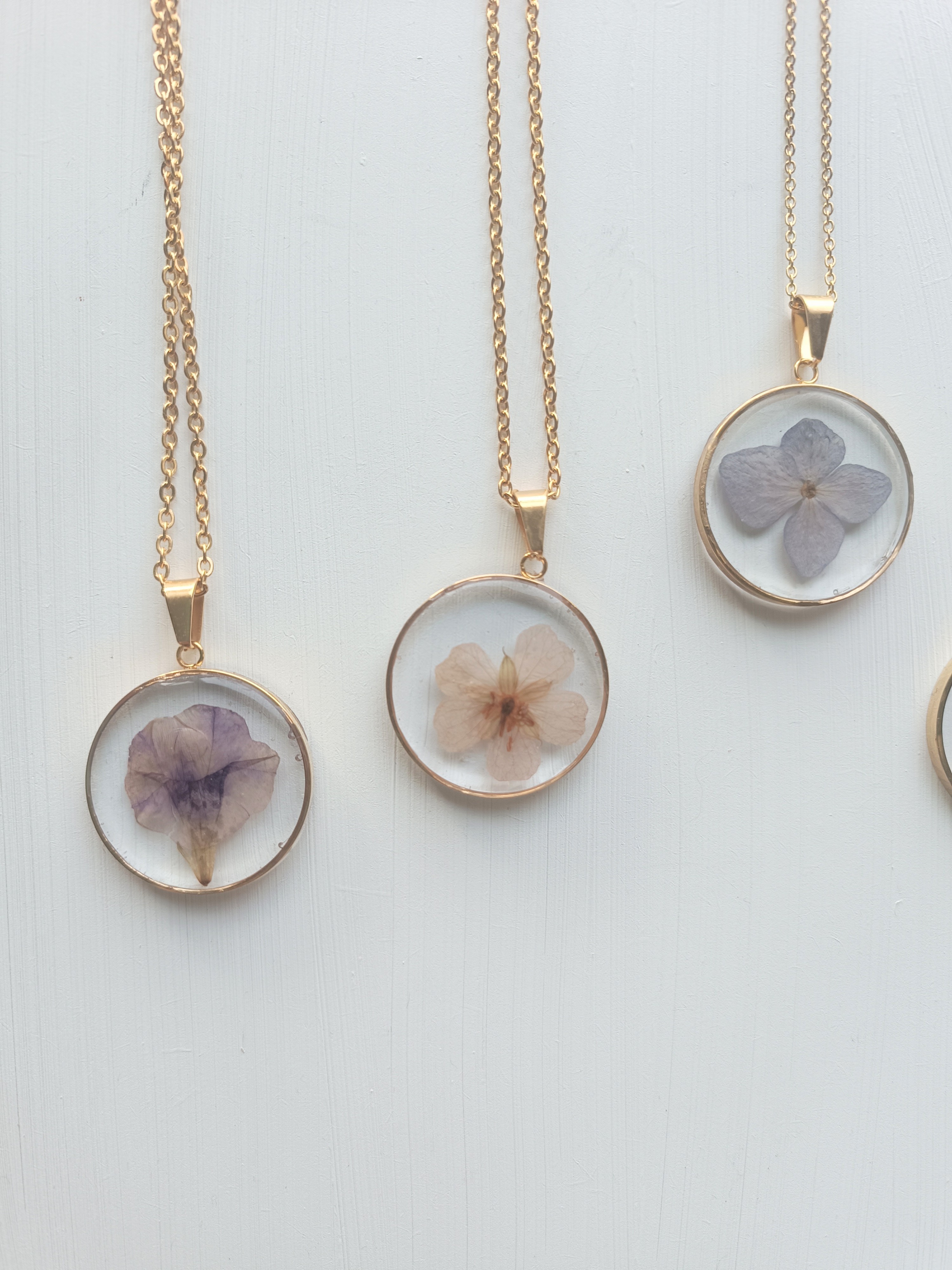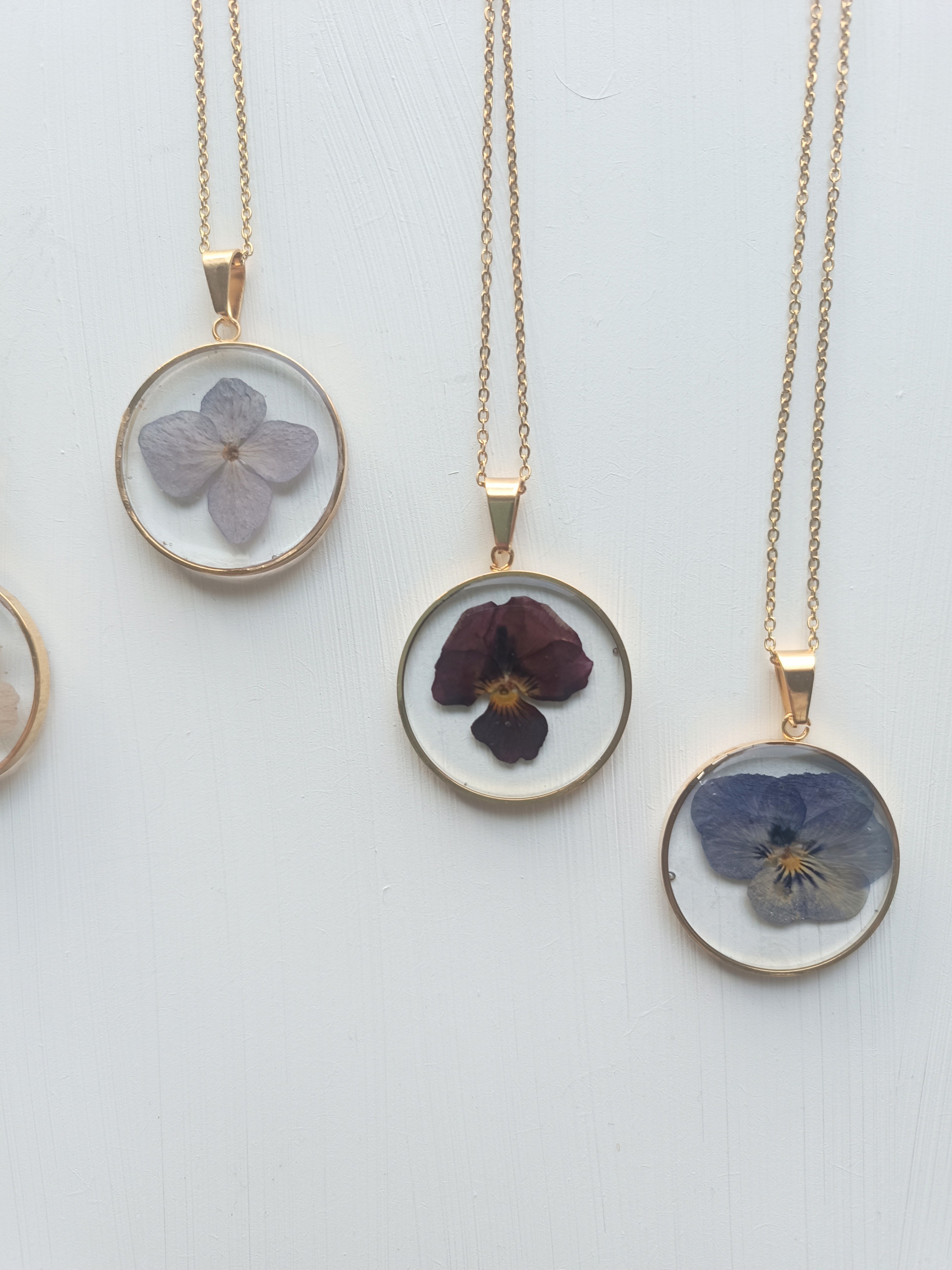 Collier avec médaillon réalisé à partir de véritables fleurs cultivés dans mon jardin et pressées par mes soins.