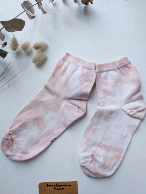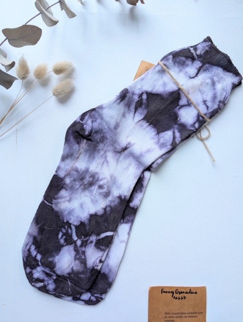 L'imprimé de chaque chaussette est unique. Je le créé artisanalement grâce à une technique de nouage avec élastiques pour obtenir cet imprimé tie & dye.